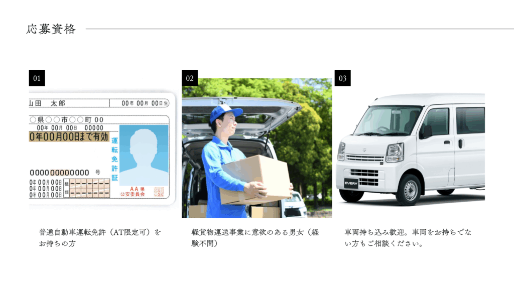 採用が決定した方には、初期費用ゼロでの契約手続き、および車両の準備(お持ちでない場合はリース・サポート)を速やかに進めます。